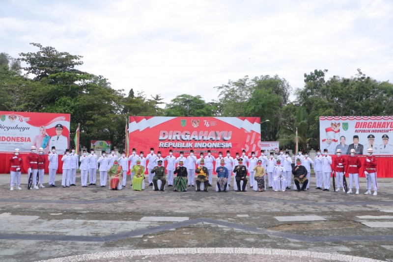 Usai upacara pengibaran Bendara Merah Putih, Wakil Ketua DPRD Inhil, Andi Rusli bersama Bupati Inhil, HM Wardan dan Forkopimda berfoto bersama di Lapangan Gadjah Mada Tembilahan, Selasa (17/8/2021).
