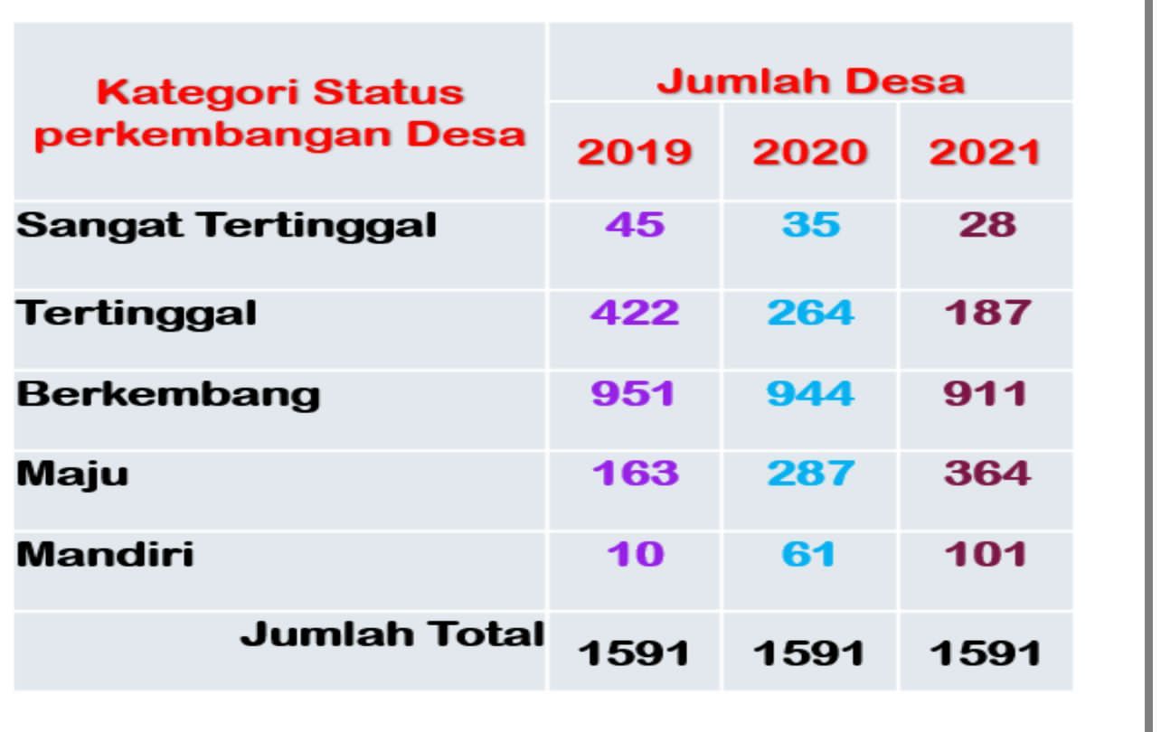 Kebalikannya, terjadi peningkatan yang sangat jauh pada jumlah desa dengan kategori maju dan mandiri. Di tahun 2019 desa maju ada 163, tahun 2021 menjadi 364 desa atau naik lebih dari 2 kali lipat. Sementara desa mandiri pada tahun 2019 hanya 10 desa, di tahun 2021 angkanya melonjak menjadi 101 desa, atau naik lebih dari 10 kali lipat.