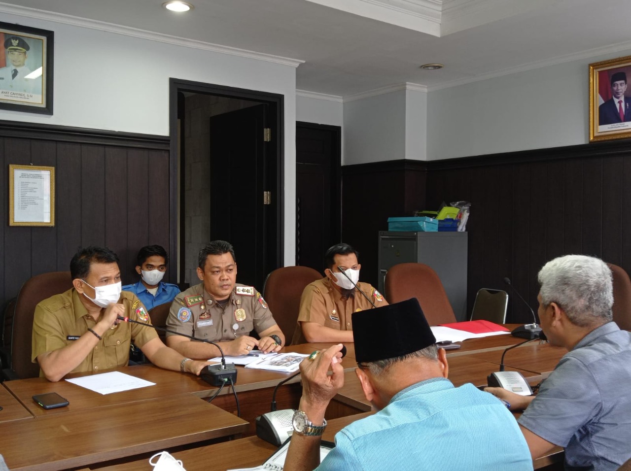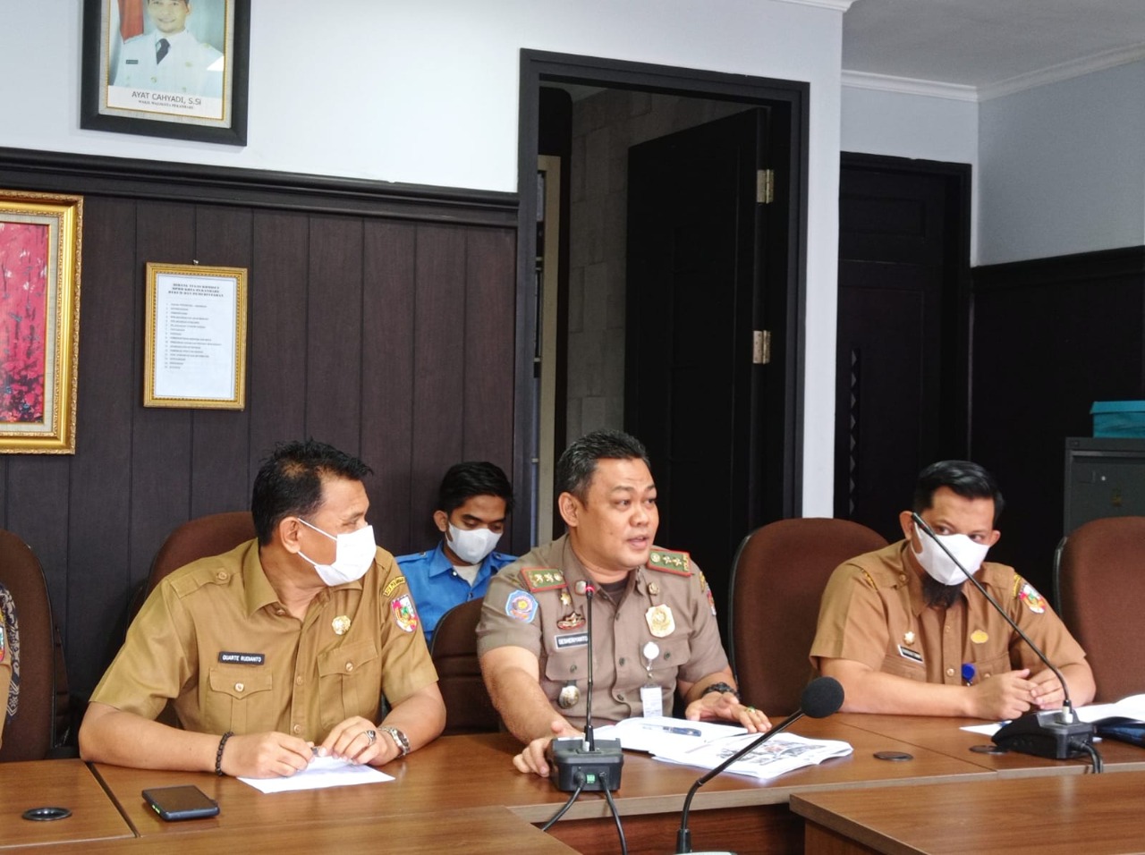Hadir dalam rapat ini Kabid Ops Satpol PP Kota Pekanbaru Reza Aulia Putra, Kepala Bidang Pengaduan, Kebijakan dan Pelaporan Layanan DPMPTSP Kota Pekanbaru Quarte Rudianto, Kepala Bagian Tata Pemerintahan (Kabag Tapem) Sekretariat Daerah Kota (Setdako) Pekanbaru Syafrian Tommy,