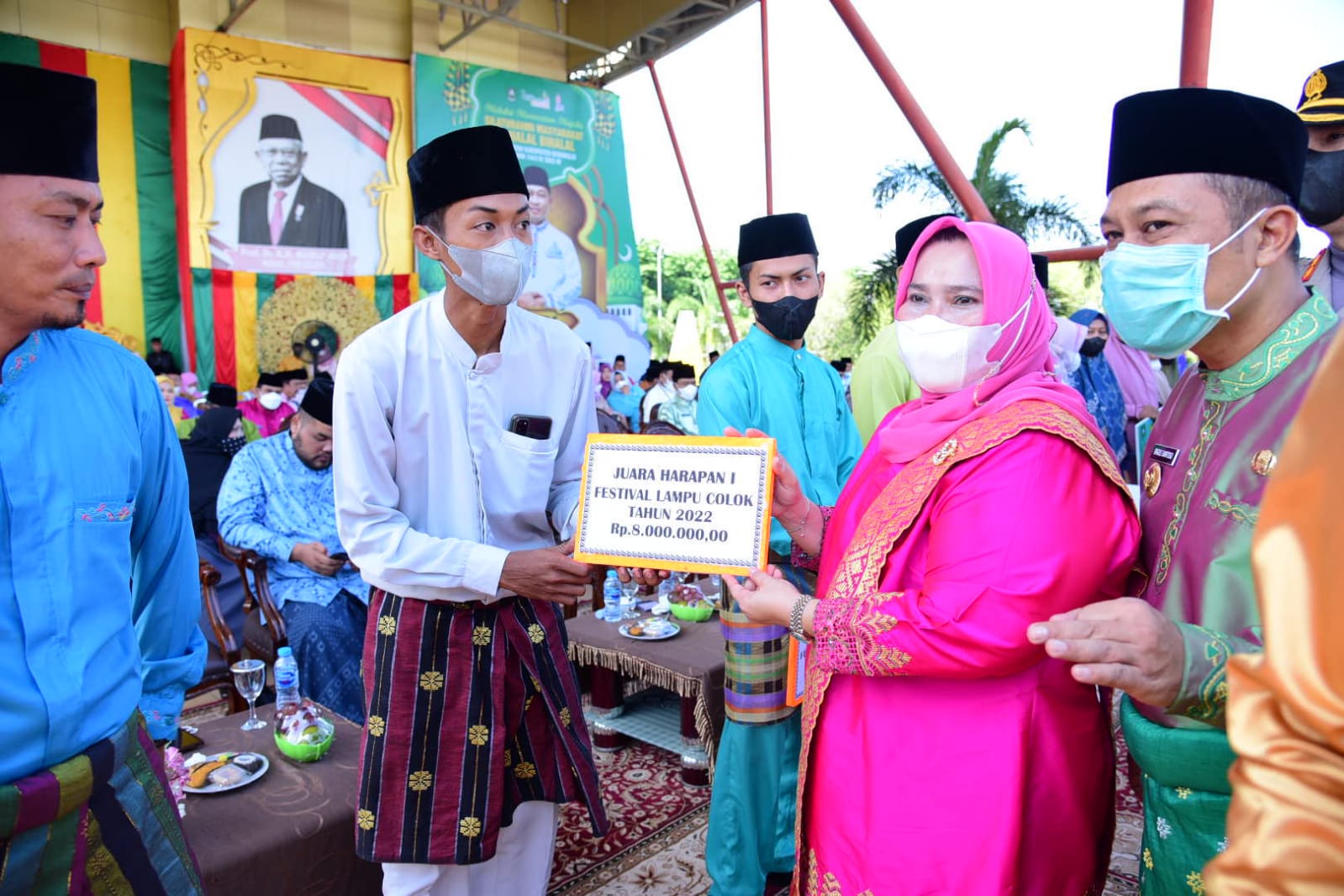 Bupati Kasmarni menyerahkan hadiah kepada pemenang festival lampu colok 2022. (Foto : Rudi)