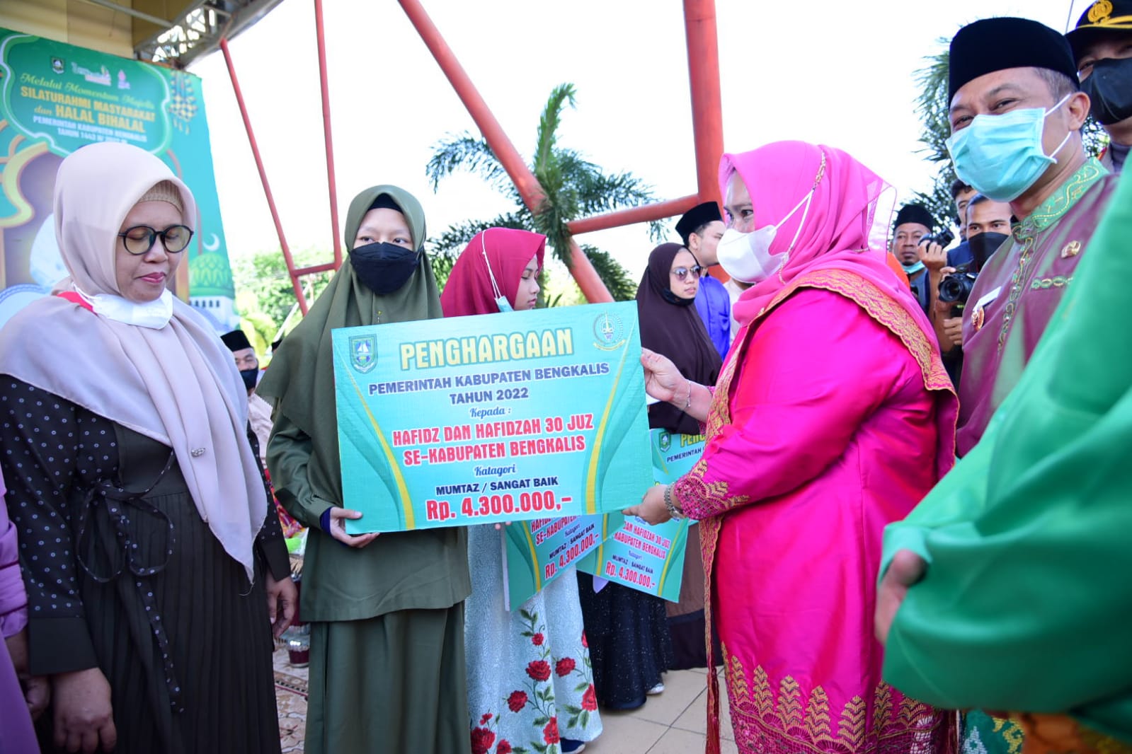 Bupati Kasmarni menyerahkan penghargaan kepada hafiz dan hafidz dan Hafidzah se-kabupaten Bengkalis 2022. (Foto : Rudi)