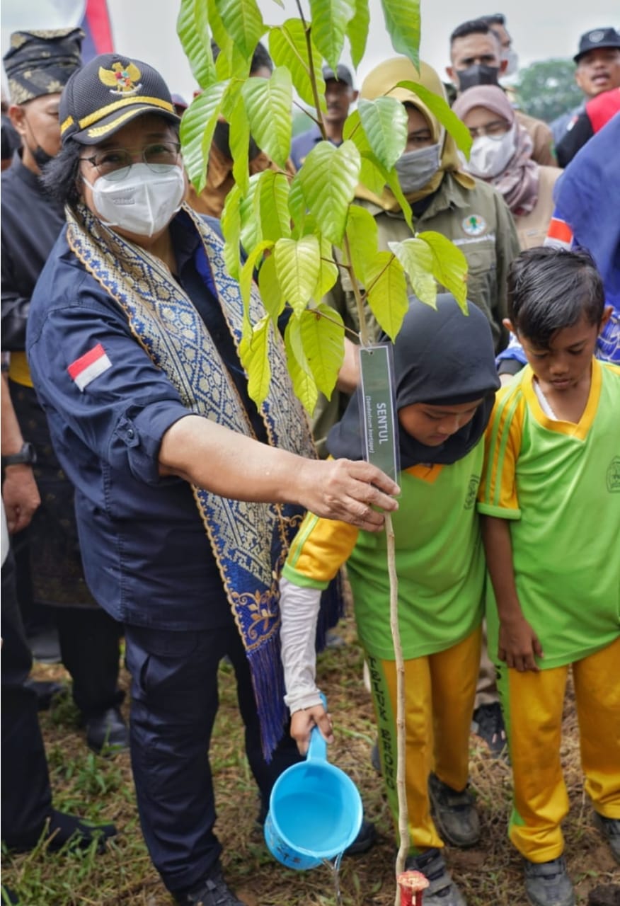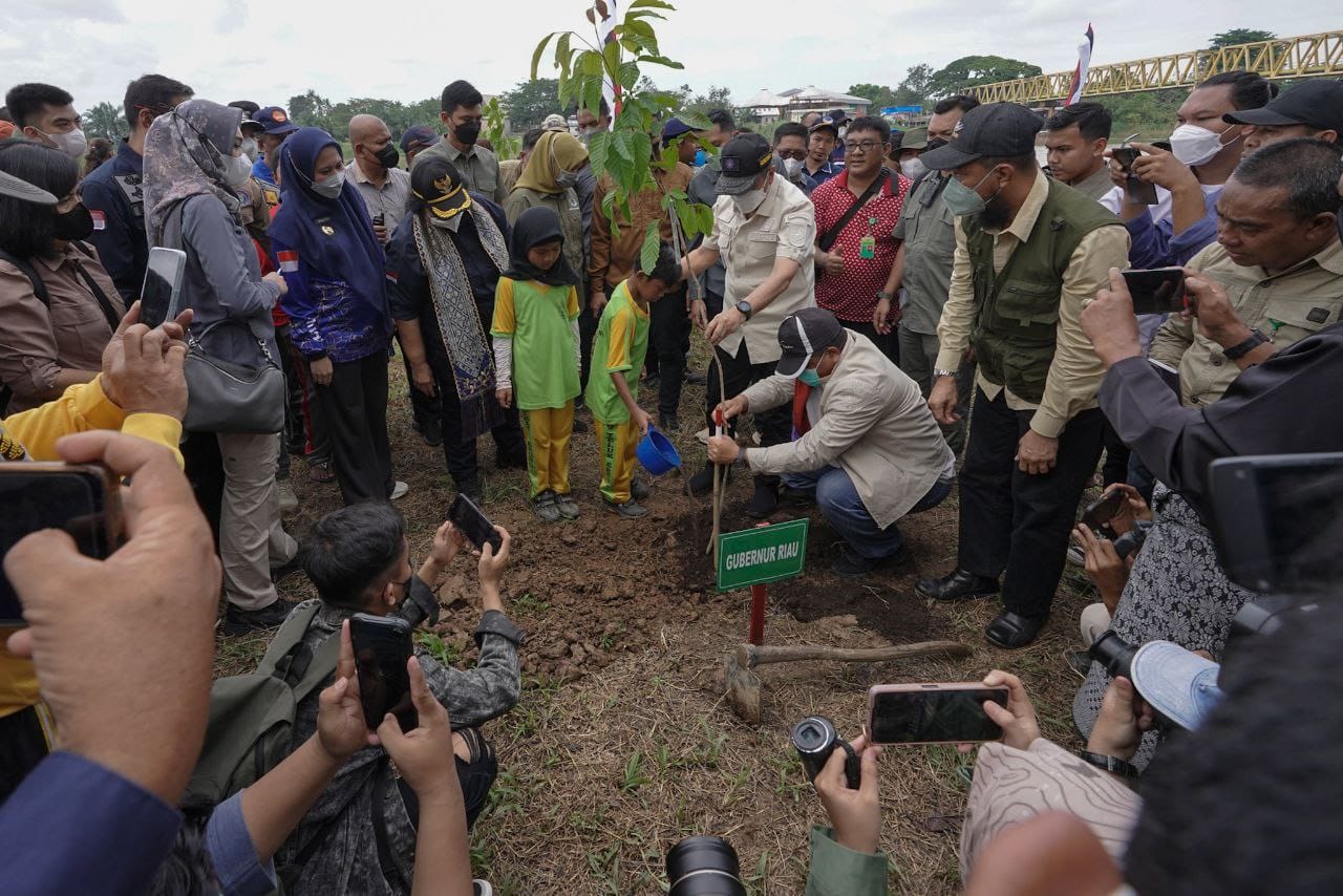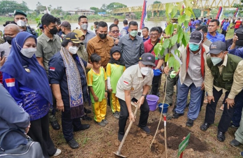 Penanaman bibit pohon dengan jenis Ketapang, Matoa (Pometia pinnata) dan Mahoni dilakukan secara simbolis oleh Menteri LHK Siti Nurbaya Bakar bersama Gubri Syamsuar, Bupati Indragiri Hulu Rezita Meylani, Forkopimda Inhu serta masyarakat setempat di tepian Daerah Aliran sungai (DAS) Indragiri, Teluk Erong, Kampung Dagang, Kecamatan Rengat, Kabupaten Indragiri Hulu, Sabtu (13/8/22).