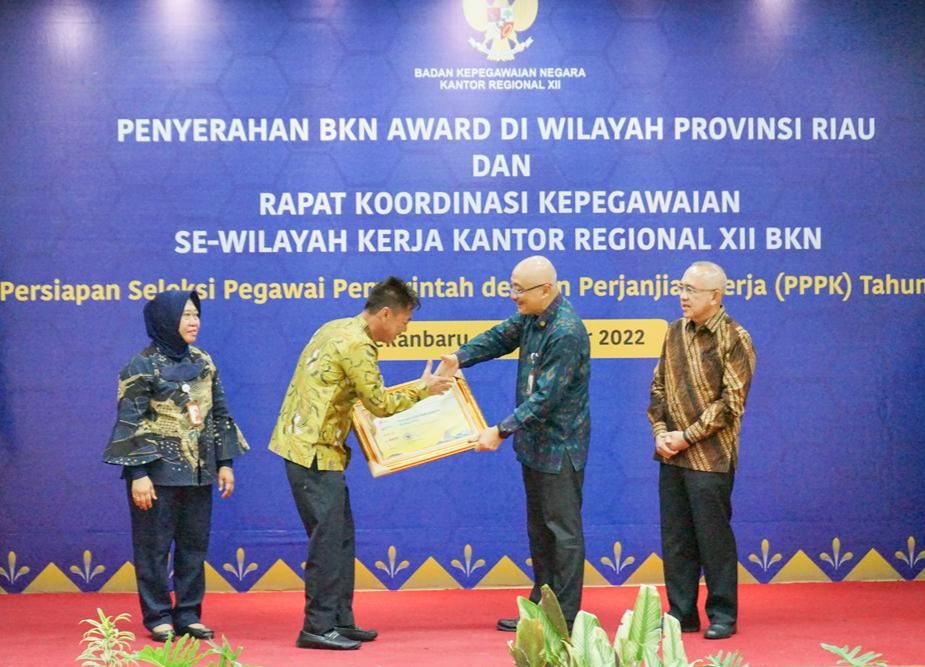 BKN Award tersebut diserahkan langsung oleh Kepala BKN Dr Ir Bima Harus Wibisana MSIS kepada Bupati Rohil Afrizal Sintong didampingi wakil bupati H Sulaiman. Selain Rohil yang dapat penghargaan dari BKN Award 2022 ini juga diberikan kepada Pemprov Riau, Pemkab Dumai, Pelalawan, Kampar dan Inhil.