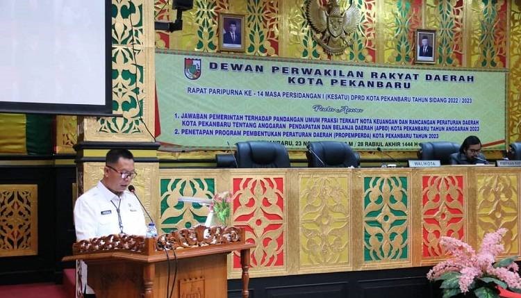 Plt Sekretaris Daerah Kota Pekanbaru Indra Pomi Nasution mewakili Pj Walikota Pekanbaru Muflihun menyampaikan ucapan terima kasih atas masukan dan pandangan dari seluruh fraksi yang ada di DPRD Kota Pekanbaru.