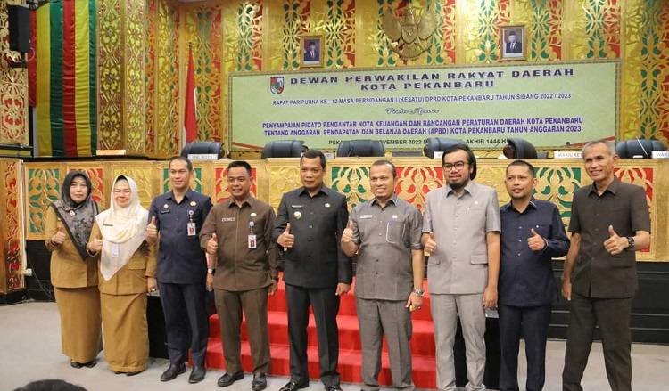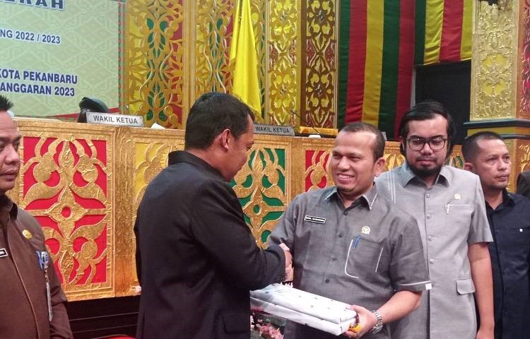 Setelah pidato nota keuangan dibacakan, Pj Walikota Pekanbaru Muflihun beserta Sekdako Pekanbaru HM Jamil beserta Asisten II Setdako El Syabrina, Asisten III Setdako Masykur Tarmizi dan Kepala Badan Pengelola Keuangan dan Aset Daerah (BPKAD) Kota Pekanbaru Yulianis menyerahkan nota keuangan dan Ranperda tentang APBD Kota Pekanbaru tahun 2023 kepada Ketua DPRD Pekanbaru Muhammad Sabarudi ST didampingi Wakil Ketua Ginda Burnama ST dan Ir Nofrizal MM.