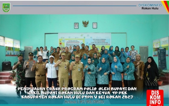 iniriau.com, Rokan Hulu - Bupati Rokan Hulu H. Sukiman didampingi Wakil Bupati Rokan Hulu H. Indra Gunawan, ketua TP PKK Hj Peni Herawati Sukiman dan Ketua GOW Rokan Hulu Sri Yulita melakukan peninjauan pelaksanaan Crash Program Polio di PTPN V Sei Rokan Kecamatan Pagarantapah Darussalam, Rokan Hulu, Selasa (07/03/2023).