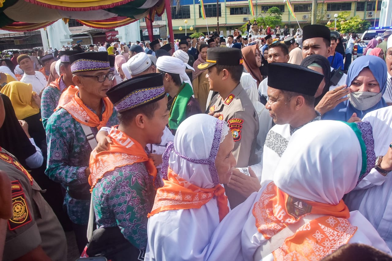 Wakil Bupati Bengkalis H Bagus Santoso didampingi Kapolres Bengkalis AKBP Setyo Bimo Anggoro dan sejumlah tamu kehormatan lainnya terlihat mata yang berkaca-kaca digenangi air mata menahan haru melepas keberangkatan JCH. Sesekali mereka mengalihkan rasa haru itu dengan canda kepada JCH yang familiar.