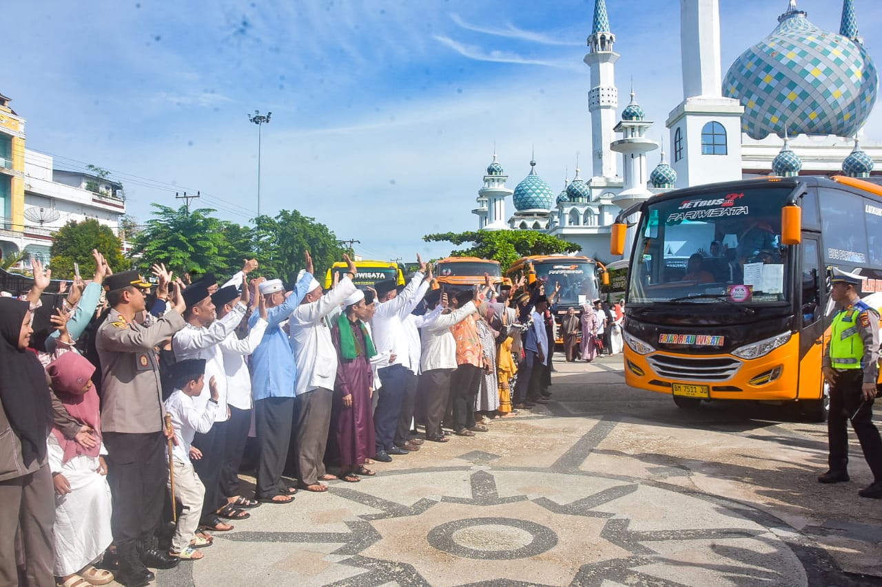 Ratusan masyarakat turut memadati halaman Masjid Agung untuk serta mengantar keberangkatan JCH diiringi tangis haru melepas kepergian saat satu persatu jamaah menaiki bus yang telah disiapkan.
