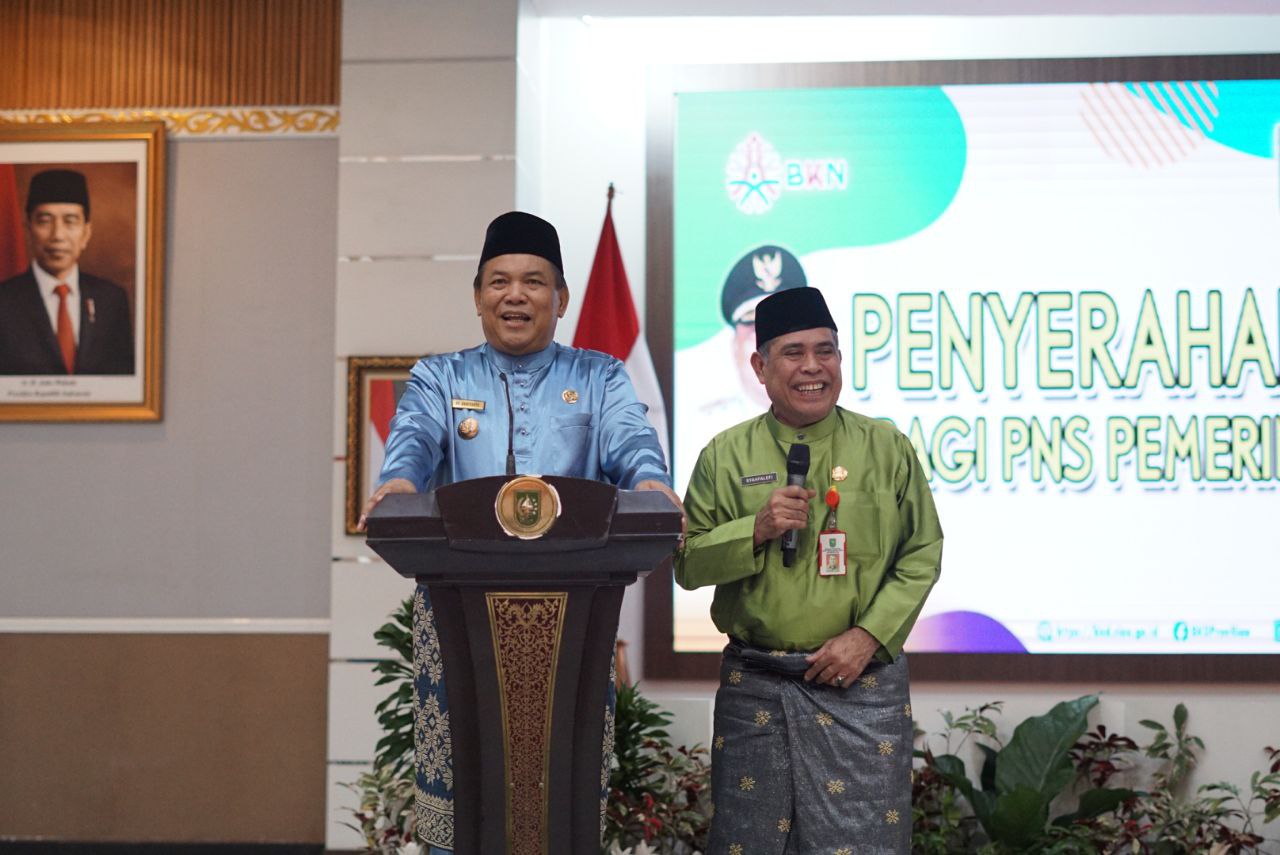 Saat penyerahan SK pensiun PNS di lingkungan pemerintah provinsi Riau, Pj Gubernur Riau didampingi Kapala Badan Kepegawaian Daerah (BKD) Riau Mamun Murod, turut hadiri Kepala Bidang Pengadaan, Pemberhentian, dan Informasi Kepegawaian BKD Riau, Endy Novelly, dan tamu undangan lainnya.(Galeri)