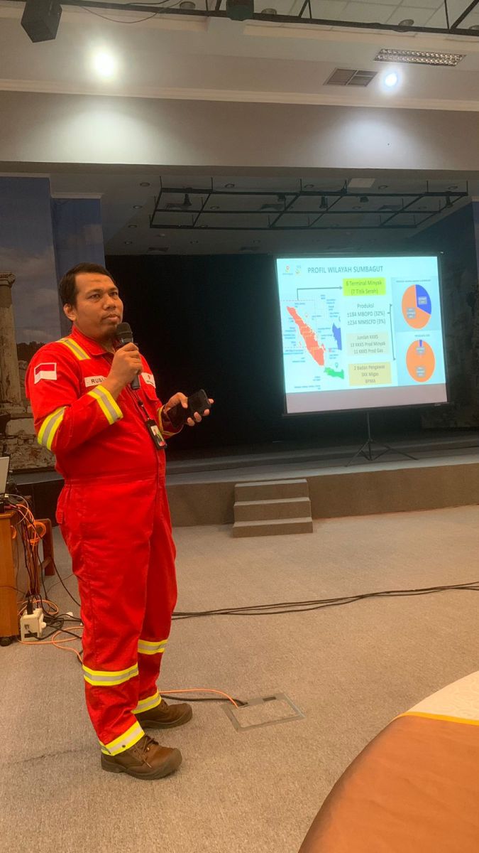 Pengawas Lifting SKK Migas Sumbagut, Ruslan memberi paparan terkait kegitan proses Hulu Migas yang terdiri dari proses eksplorasi dan eksploitasi, hingga dengan titik serah (lifting migas).