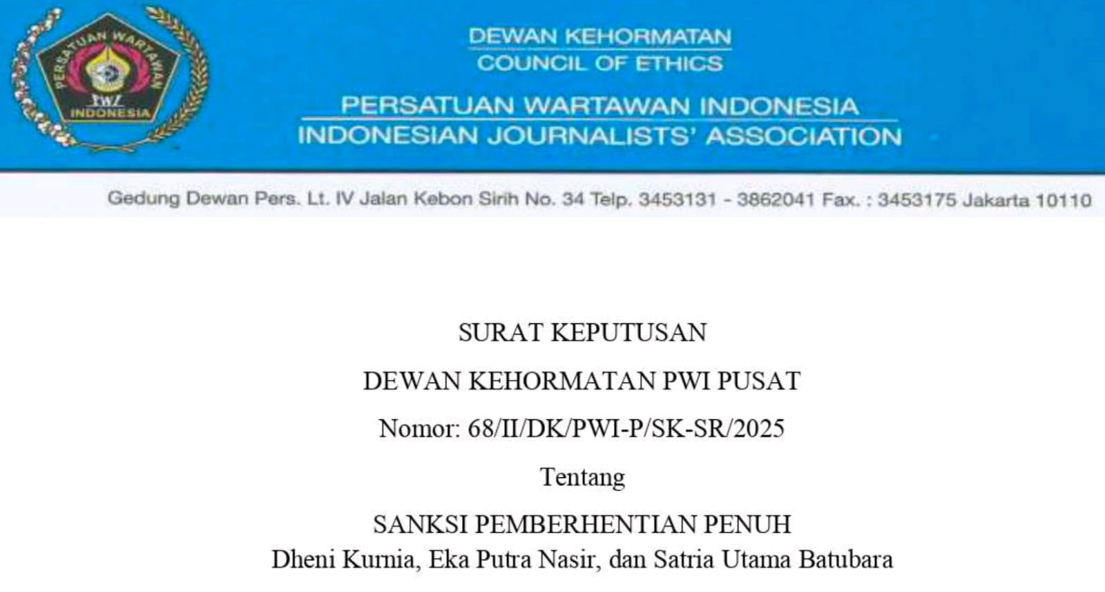 Sanksi pemberhentian penuh terhadap 3 orang anggota PWI Riau ini berdasarkan Surat Keputusan Dewan Kehormatan PWI Pusat nomor 68/II/DK/PWI-P/SK-SR/2025.